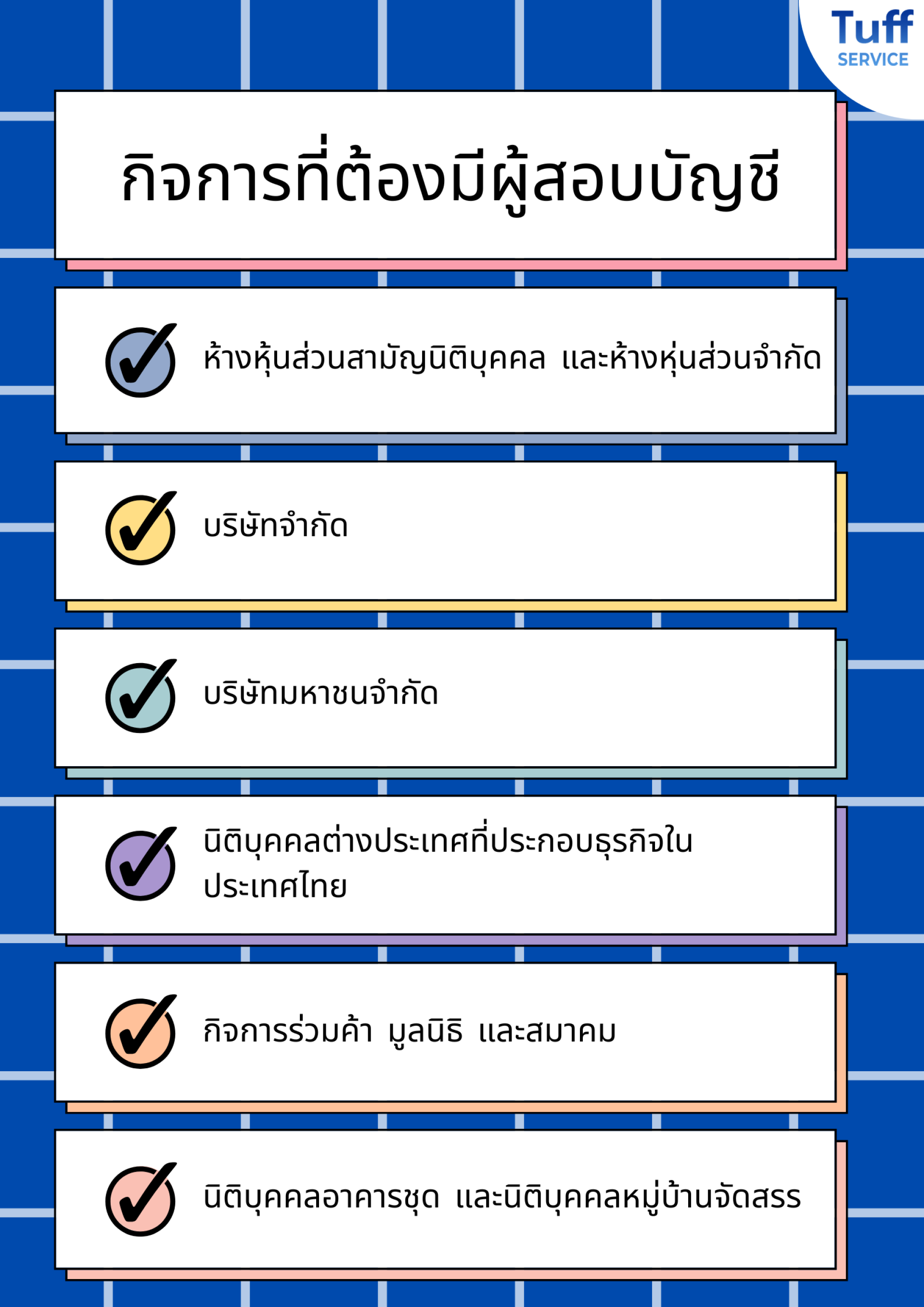 กิจการที่จดทะเบียนเป็นนิติบุคคลที่ต้องมีผู้สอบบัญชี ตรวจสอบงบการเงินของกิจการ ประกอบด้วย